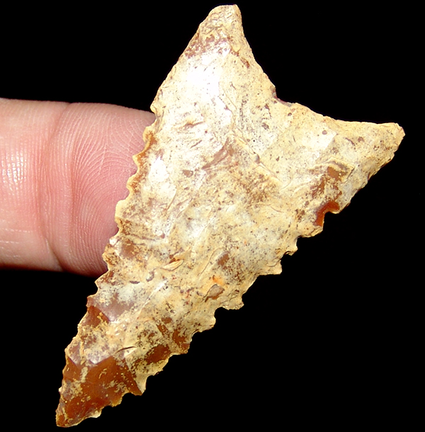Love the creamy patina over the amber colored translucent, coastal plains chert. Nicely serrted has heavy basal grinding.