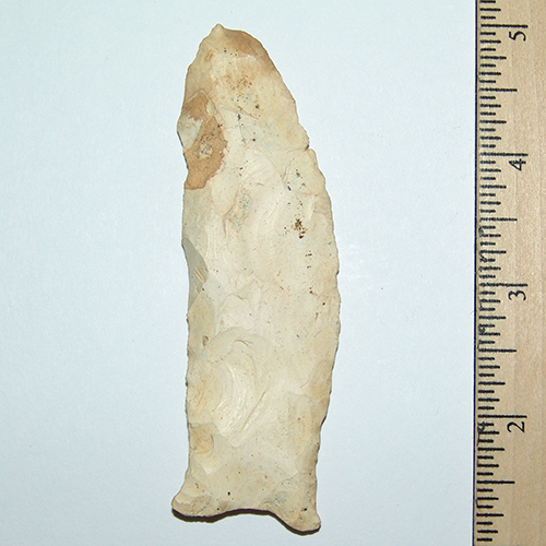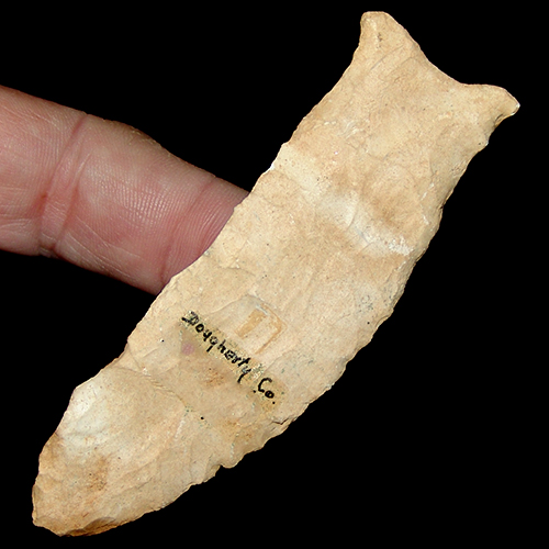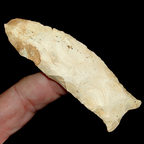 Very unique Suwannee with nice curved blade and classic flaring ears. Nice basal grinding in the hafting area and thick creamy white patina and above average length.Nice Burrin tip. Ex Beutell collection.