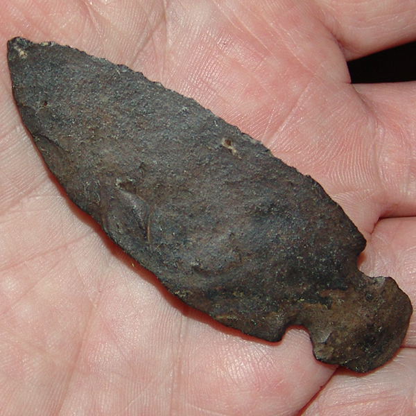 Dark tannic staining on this excellent Waller knife with nice edge retouch, and classic unifacial design, nicely notched with a nice stem.