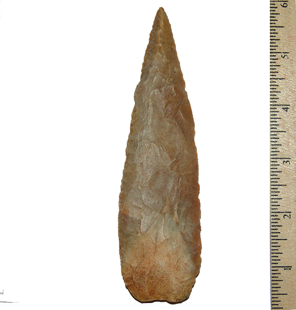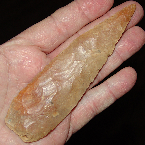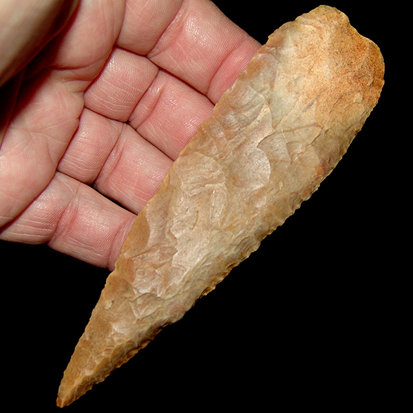Nice sand and creek polish from eons of being hidden in a small private creek, most likely lost by the ancient user. Nice beveling, some translucence, gentle beveling on the blade edges, good tip and nice basal grinding in the hafting area. Centerpie...