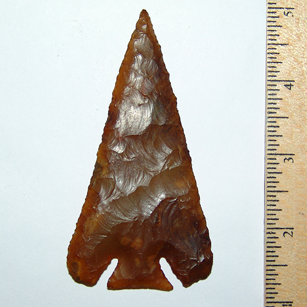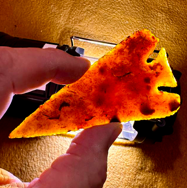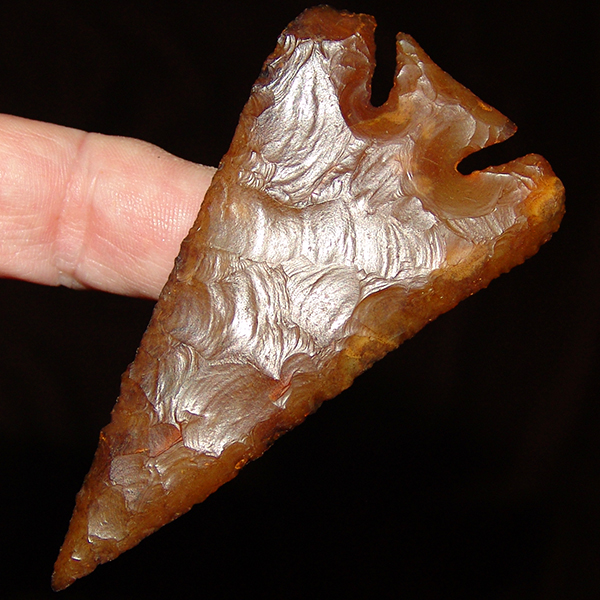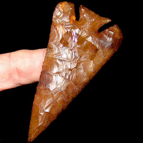One of the finest Clay points ever recovered with outstanding color, polish, workmanship, and translucence.Very thin and perfectly preserved and the notches were anciently fashioned by an ancient master craftsman. This is one of the finest known and will certainly be priced accordingly. Ex Beutell