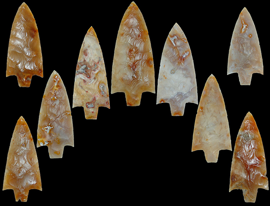 One of the finest Newnan Caches ever found! Nine gorgeous Newnans made of high grade Hillsborough RIver Basin agate that is both colorful and translucent. These were made by an ancient master and arranged in a semi circle and spaced in a half moon formation, several feet apart.Will only be sold as a cache, not broken up or sold separately. Thin and most are museum quality. No tire kickers please.