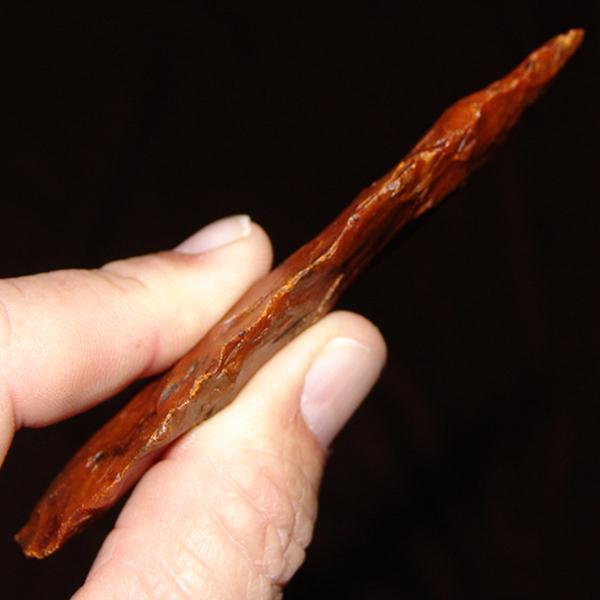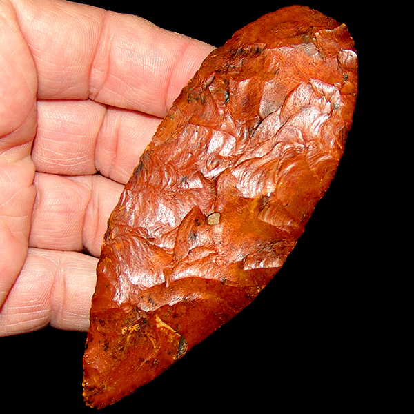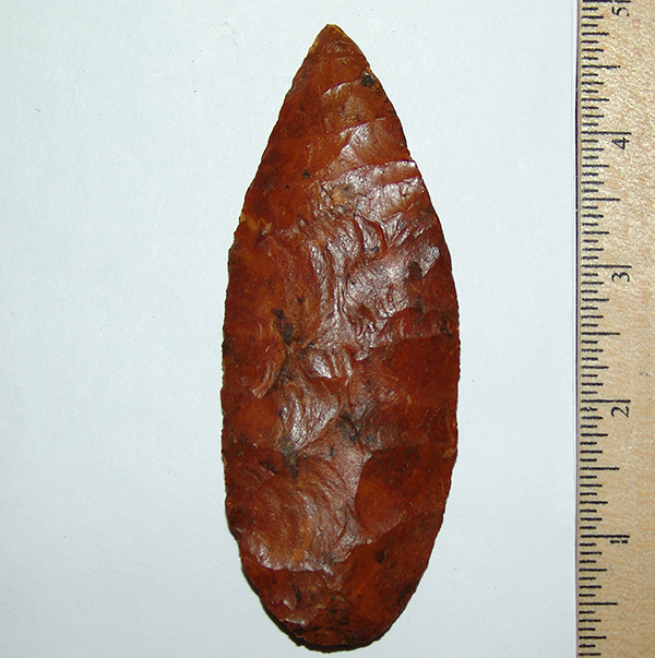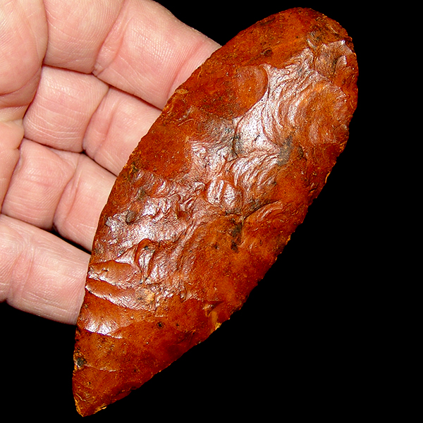 Nice color, some translucence, deeply stained with nice basal grinding in the hafting area. Displays equally well on either face and a nice centerpiece in excellent condition