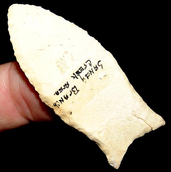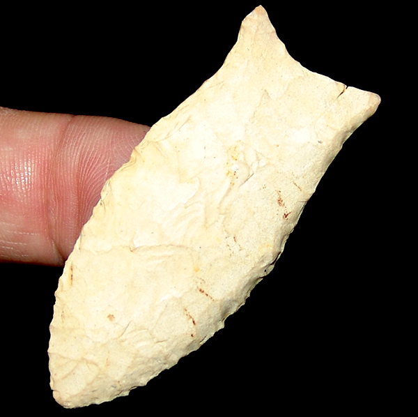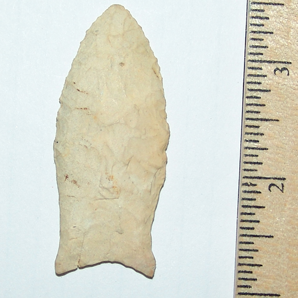 Very nice Ross County style Clovis with creamy patina and in excellent condition. Heavy basal grinding in the hafting area. Nice basal thinning, intact ears and immaculate condition. Ex Beutell