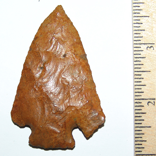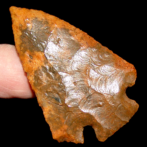 Thin and super polished, this Clay was anciently resharpened on one blade edge more than the other, resulting in assymetrical, yet intact, ears which are the norm with clays - almost all examples exhibit this feature. Excellent color and in excellent condition.